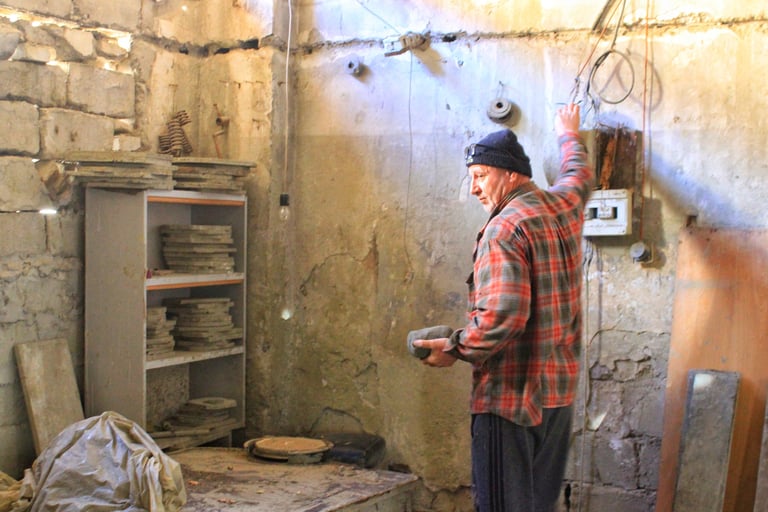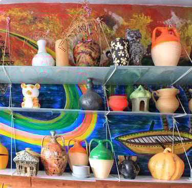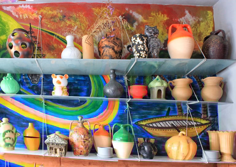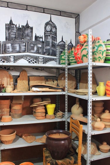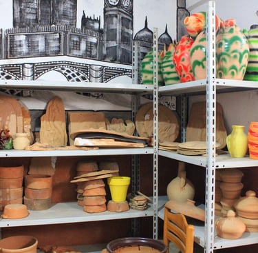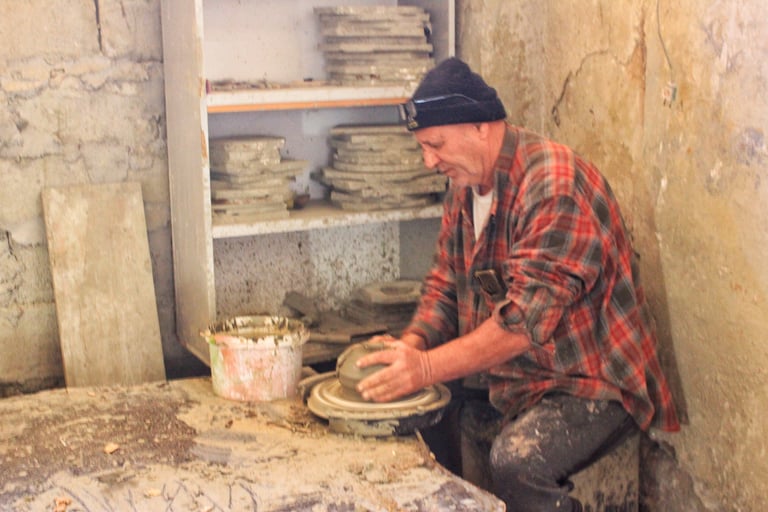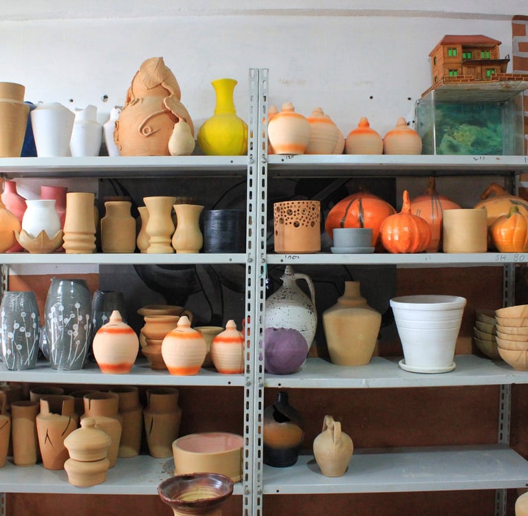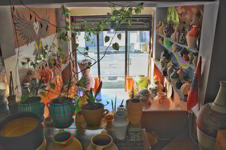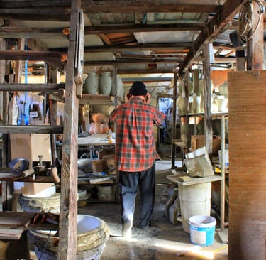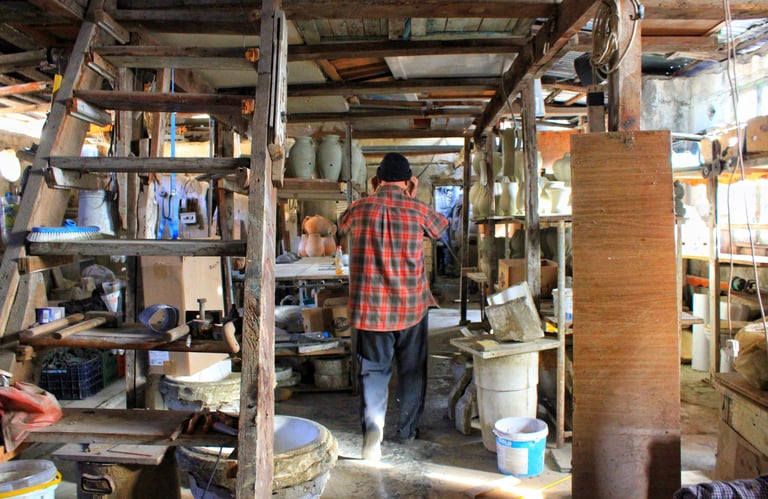 Inside, the potter—covered in clay—greeted me warmly and guided me to the back of the shop. There, I found myself getting a behind-the-scenes tour of his workshop, surrounded by pots upon pots. He then grabbed some clay, sat at his wheel, and gave me a quick demonstration.