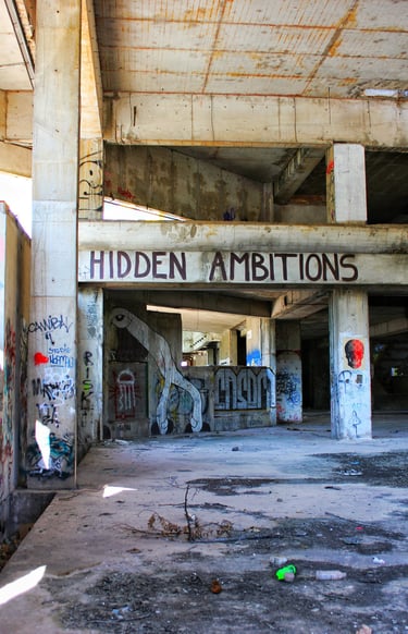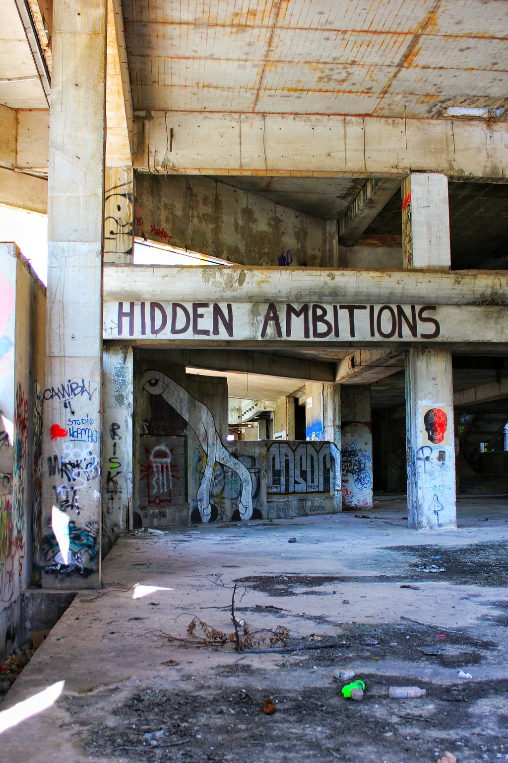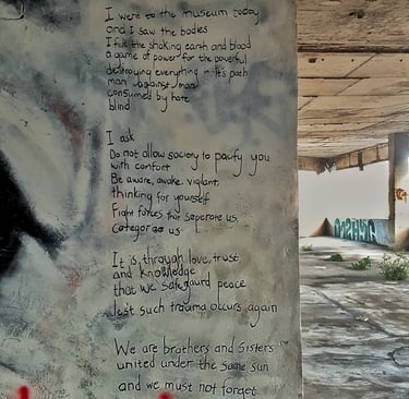 Bullet holes riddle the structure, and inside, the building is stripped bare—its marble floors cracked, its walls tagged with layers of graffiti. Yet it's also become a kind of unofficial gallery, covered with street art and messages of peace and protest.
