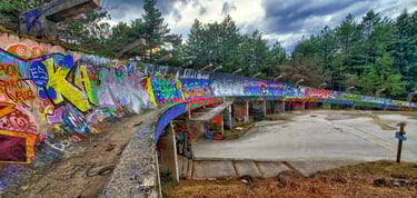 Today, the bobsled and luge track lies abandoned, a haunting yet captivating relic of the past. Nature has started to reclaim it. Moss creeps along the walls, trees stretch their limbs across its edges, and colorful graffiti now blankets nearly every surface. Artists have turned it into a kind of open-air gallery — vibrant and expressive.