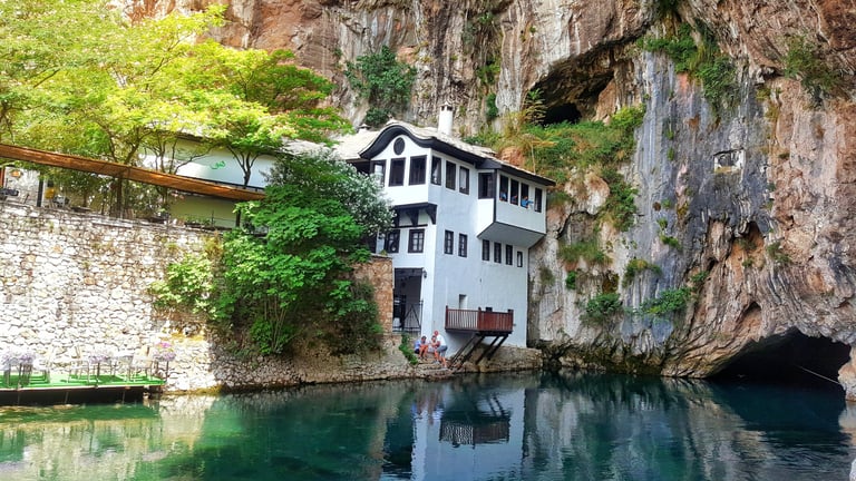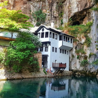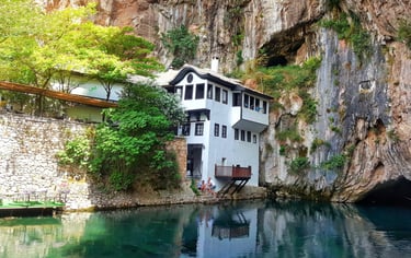 Blagaj Tekke is a really beautiful and peaceful spot just a short drive from Mostar—about 20 minutes or so. It’s a historic Sufi monastery built in the 1500s, tucked right up against a cliff where the crystal-clear Buna River flows out of a cave.