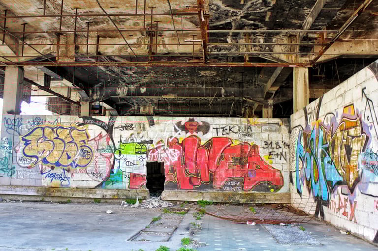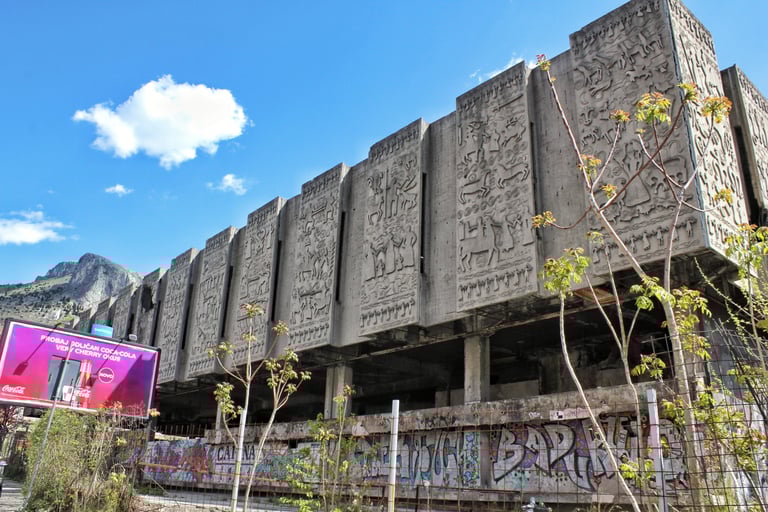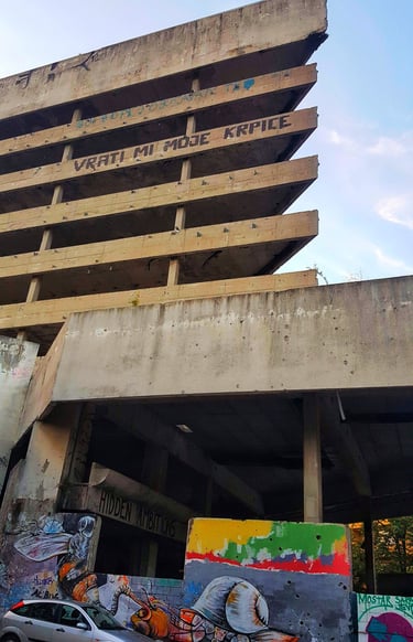 These crumbling structures, left behind after the Bosnian War, are raw and haunting. Bullet holes still pockmark their facades, and shattered windows frame views of a city that’s moved on without them. Once homes, hotels, or government buildings, they now stand empty, overtaken by nature, graffiti, and time.