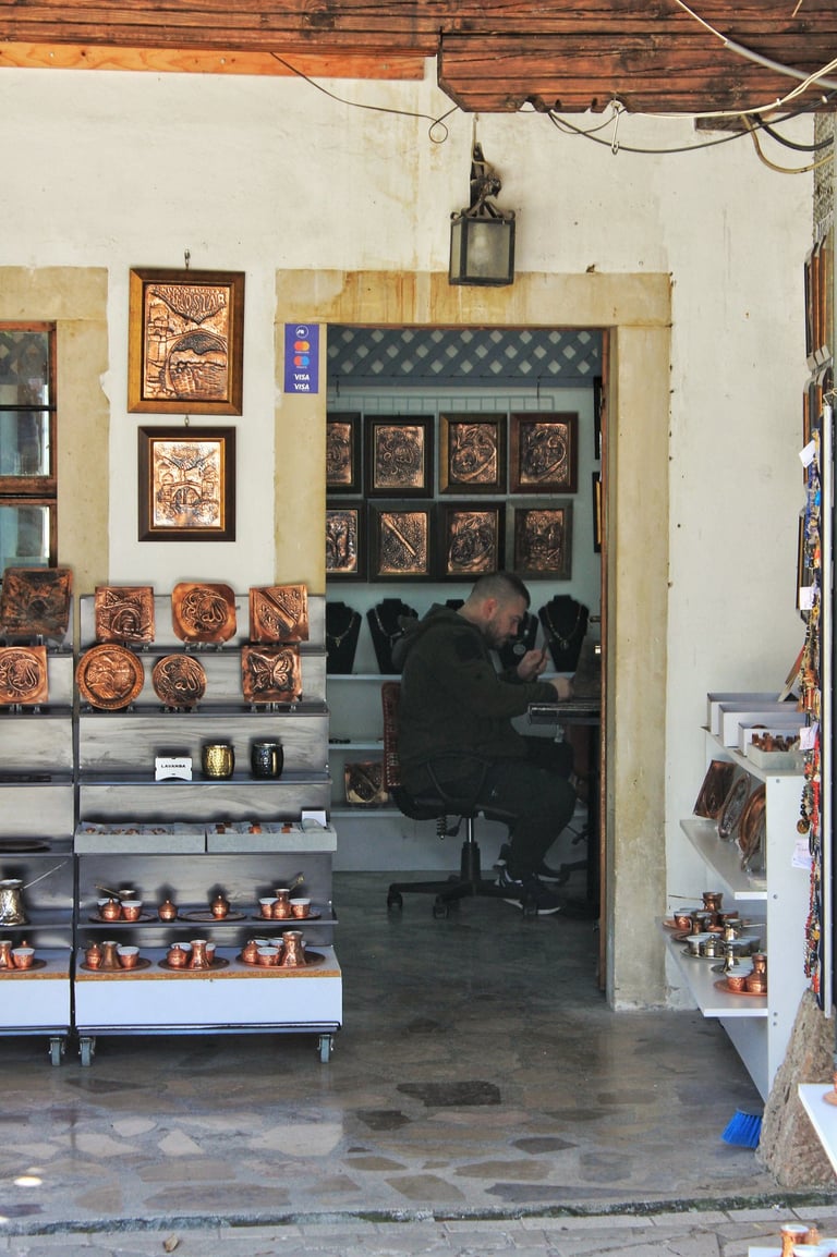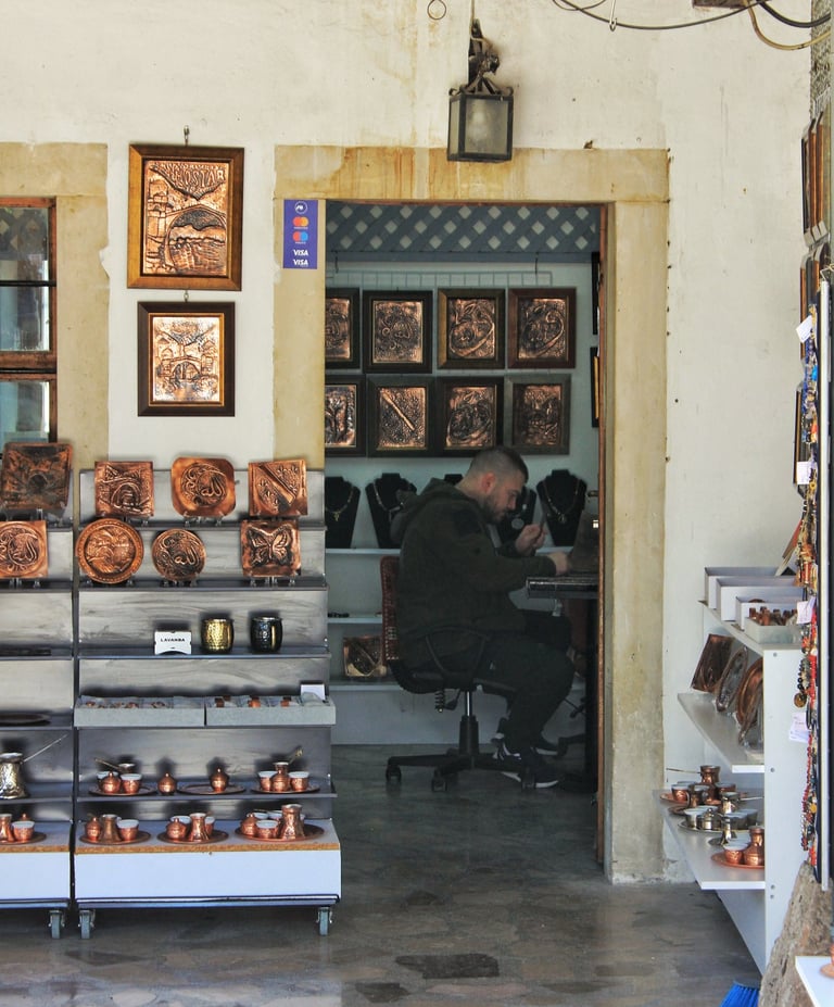 You’ll find master coppersmiths seated outside their shops, shaping and etching designs into trays, coffee pots, and decorative plates using techniques that date back to the Ottoman era. Many have been doing this since they were children, learning from parents and grandparents who did the same. Inside, the shelves shimmer with polished copper, each piece unique and hand-finished.