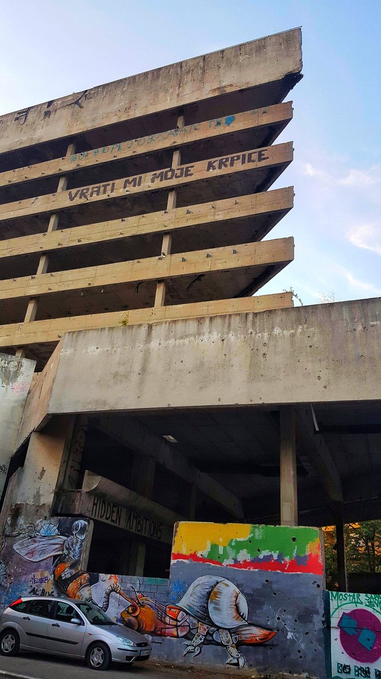 Then came the war in the ‘90s, and the building got wrecked. A huge chunk of it collapsed, and since then, it’s just… stood there. Half-ruin, half-art piece. Trees are growing out of it now. The whole vibe is very “post-apocalyptic urban jungle.”