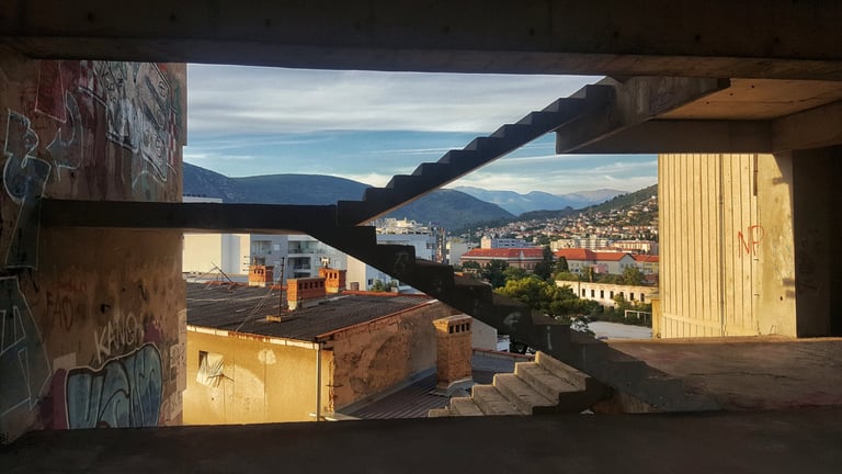 One of the most infamous abandoned sites in Mostar is the Sniper Tower—a towering concrete skeleton that looms over the city. Originally built in the 1970s as a bank, it became something far more sinister during the Bosnian War. Due to its height and strategic location, it was repurposed as a sniper outpost during the Siege of Mostar (1992–1995). From its upper floors, snipers had a clear line of sight over much of the city, especially the front lines that divided East and West Mostar.