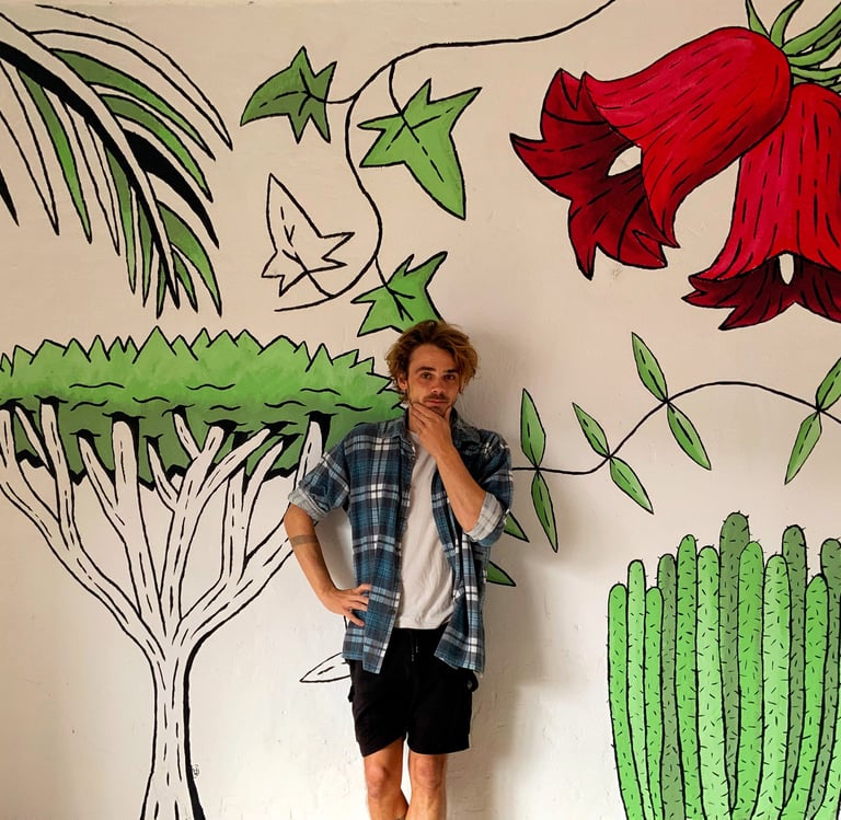 Jake’s artistic journey began while travelling in Chacahua, Mexico, where he saw a girl selling stickers and decided to give it a try. What started with sticking designs on his water bottle quickly turned into a small business, with one of his designs selling out on the first day.