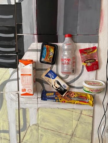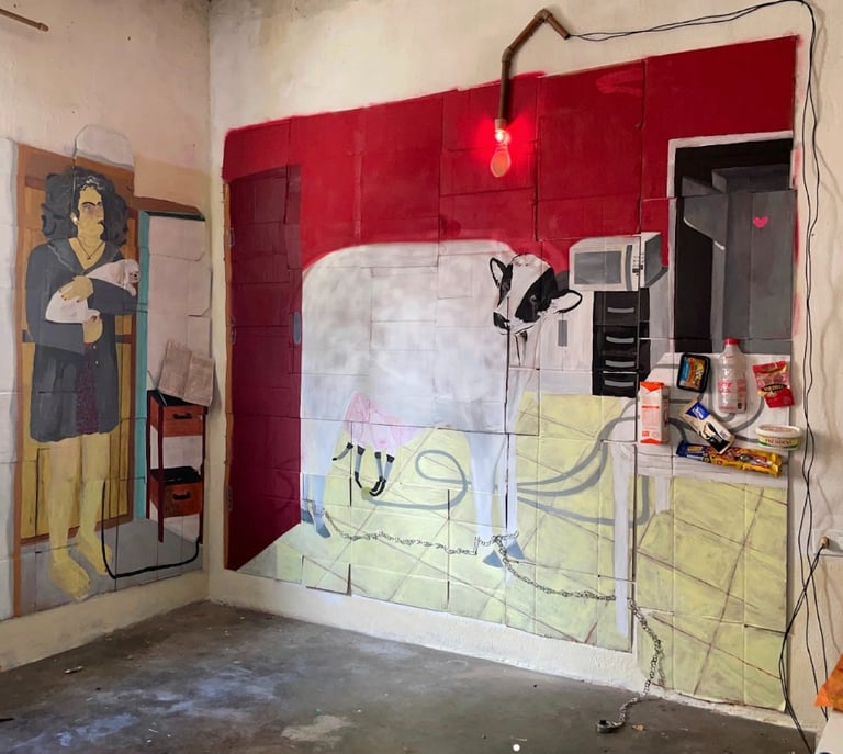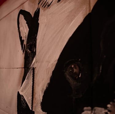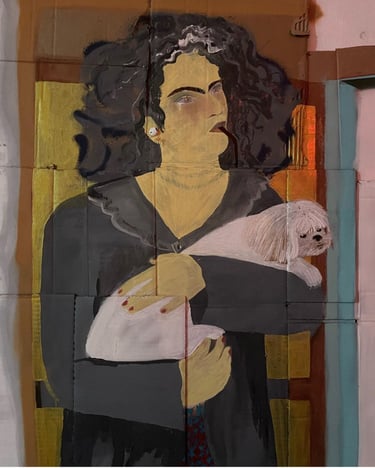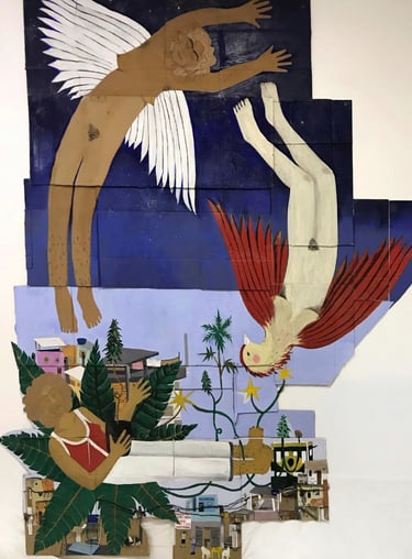 "Cardboard has become the perfect medium to express this duality—the contrast between the fragility of life and the exploitation inherent in capitalism. By choosing a material that is both fragile and disposable, I create a contrast between the powerful, often unsettling content of my paintings and the vulnerability of the medium itself. This reflects my worldview: something that may seem transient or worthless can carry profound, urgent significance". - Kaô