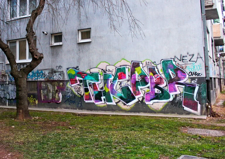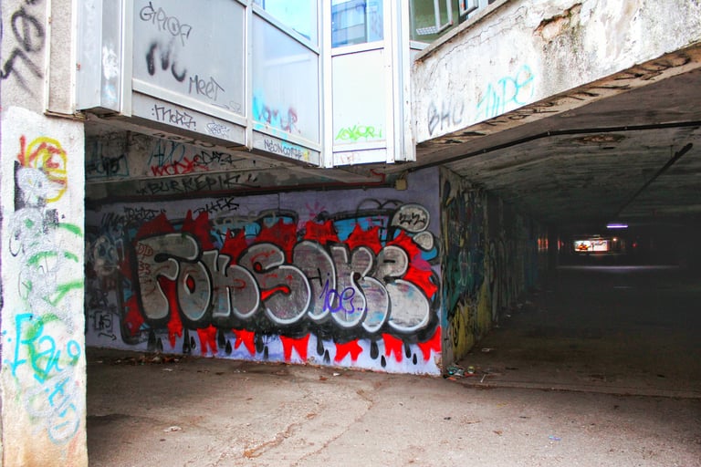 As you get closer to Sarajevo’s city centre, the streets are covered in graffiti. Tags are everywhere—on apartment blocks, along the roads, in car parks, and the underpasses. These are a few of my favourite spots I stumbled upon and loved exploring, especially the underground car parks. There’s something about the way the art takes over those dark, forgotten spaces. It’s like the city’s walls are talking, with wild style lettering and little scribbles scattered all over the place. You can't miss it—every corner has its own splash of colour, and it gives the whole place this gritty, raw vibe. It's like a mix of rebellion and creativity, filling the city with its own kind of energy.