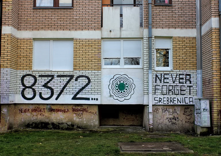 Murals are dedicated to the victims of the Srebrenica genocide, which happened during the Bosnian War in 1995. You’ll see powerful images and messages like “Never Forget” or just “Srebrenica,” often alongside the white lily, a symbol of remembrance. These pieces make sure people don’t forget what happened and push back against those who try to deny it.